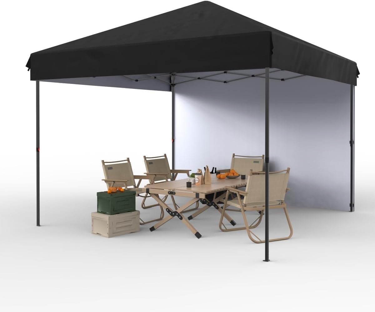 One-Button Instant Setup – Ready in 60 Seconds! Say goodbye to complicated assembly! Our 10x10 Pop Up Canopy Tent features a patented one-button push system that lets you set up solo in under a minute—no tools or extra hands needed. Perfect for beach days, backyard BBQs, camping trips, or sports events, this instant canopy delivers instant shade wherever adventure takes you. Ultra-Durable 210D Oxford Fabric & UPF 50+ Sun Protection Built to last, the heavy-duty 210D Oxford fabric (30% thicker than standard 150D!) blocks 98% of harmful UV rays while resisting tears, wind, and light rain. Paired with a rust-proof steel frame and reinforced joints, this canopy stays sturdy in breezy conditions. Stay cool and protected under UPF 50+ certified shade, rain or shine! 3 Adjustable Heights + Removable Sidewall for Versatility Customize your space with 3 height settings (8.2ft to 9.8ft) to suit any occasion—host a party, create a market stall, or relax at the beach. The included detachable sidewall adds privacy, shields against sideways sun, or blocks wind, making this canopy ideal for patios, festivals, trade shows, or outdoor dining. All-in-One Stability & Portability Stay secure in any weather! The canopy comes with 4 sandbags, 8 stakes, and 4 guy ropes for maximum stability. Pack everything—including the pre-assembled frame and fabric—into the heavy-duty roller bag with wheels for effortless transport. Compact and lightweight, it’s your go-to shelter for camping, tailgating, or spontaneous outings.