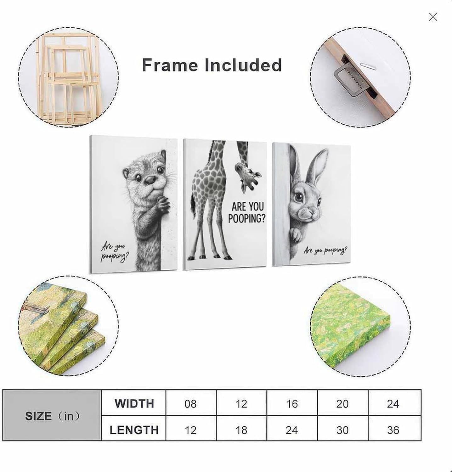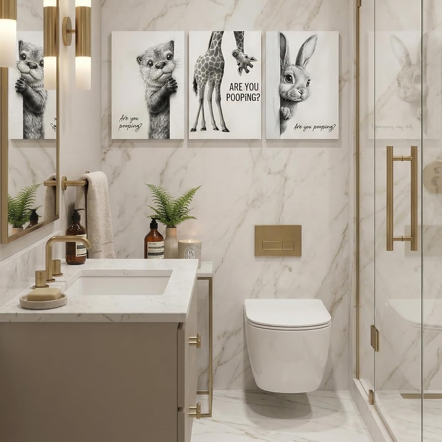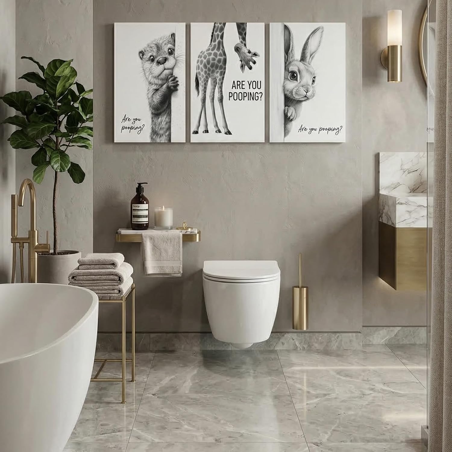 Transform Your Restroom with Funny Peeking Animals Canvas Decor Surround yourself with positivity and humor. Our 3-Piece Funny Bathroom Wall Decor collection is designed for those who love to add a touch of personality and unexpected joy to their rest room. If your bathroom feels a bit blank, these three charming characters will change that instantly. Exceptional Craftsmanship: We use advanced HD micro-spray technology on thick, waterproof canvas to ensure every peek of the otter, giraffe, and rabbit stands out with crystal-clear precision. The artwork is UV-resistant and built to last without fading, even in the humid environment of a restroom. Bring the laughter and a touch of modern monochrome elegance to your walls. Add this peeking animal bathroom art to your home today!