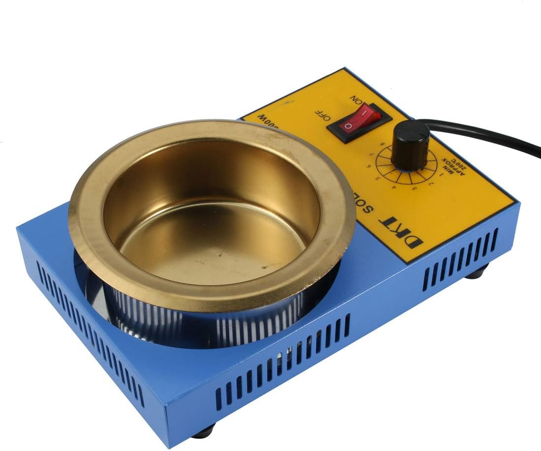 AC 220V 50HZ 300W Round Solder Pot Soldering Desoldering Base Blue GoldTin furnace, with a rotary button for adjusting the temperature, ON/OFFswitch.Features a square overflow tray below the round solder pot, to receive leaked solder.Quick temperature rise, economy of electric power, easy to operate.