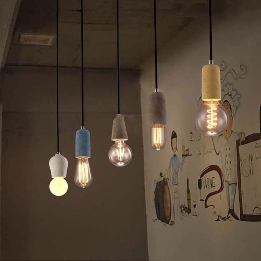 Basic Information:Product Name: Hanging LampUsage: Indoor LightingSize:WhiteHeight: 10cm/3.9inWidth: 8cm/3.1inBlueHeight: 10cm/3.9inWidth: 5cm/1.9inYellowHeight: 9cm/3.5inWidth: 7cm/2.7inPrimary colorHeight: 10cm/3.9inWidth: 5cm/1.9inChain/cord Length: 200cm/78.8inCeiling Mounting Disc Diameter: 10 cm/3.9 inIrradiation Area: 10 - 15Specification:Color: White,Blue,Yellow,Primary colorMaterial: Iron art, cementLighting Styles: Industrial, Metal, Nordic, Modern, MinimalistProduct parameters:Voltage: 110V- 240V (inclusive)Wattage: 40W maxLight source Base: G80*1 (bulb not included)Package Included:1x Pendant Light