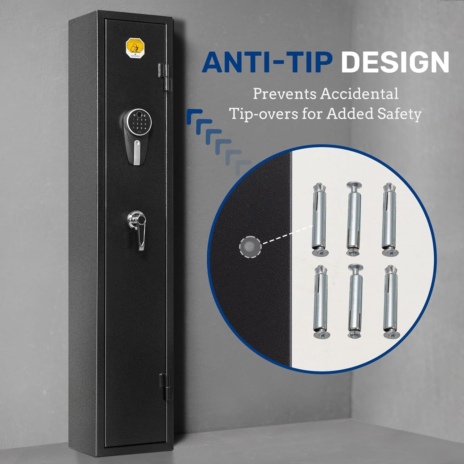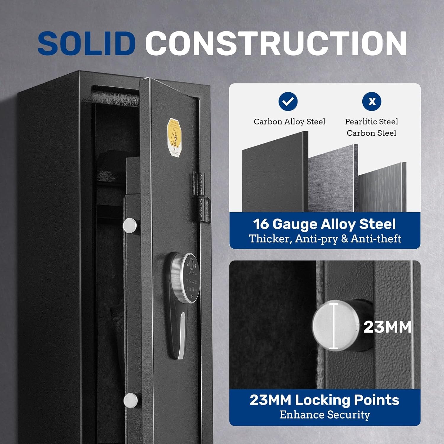 External size: 52''H x 9.8''W x 8.7''D, Internal size: 51.8''H x 9.7''W x 6.1''D, with space for up to 4 long rifles and 5 handguns. Features a 3-slot pistol rack, 2 removable 2-slot rifle racks for organized firearm storage. 180° opening door panel includes 3 gun magazine organizers and 2 pistol pockets.