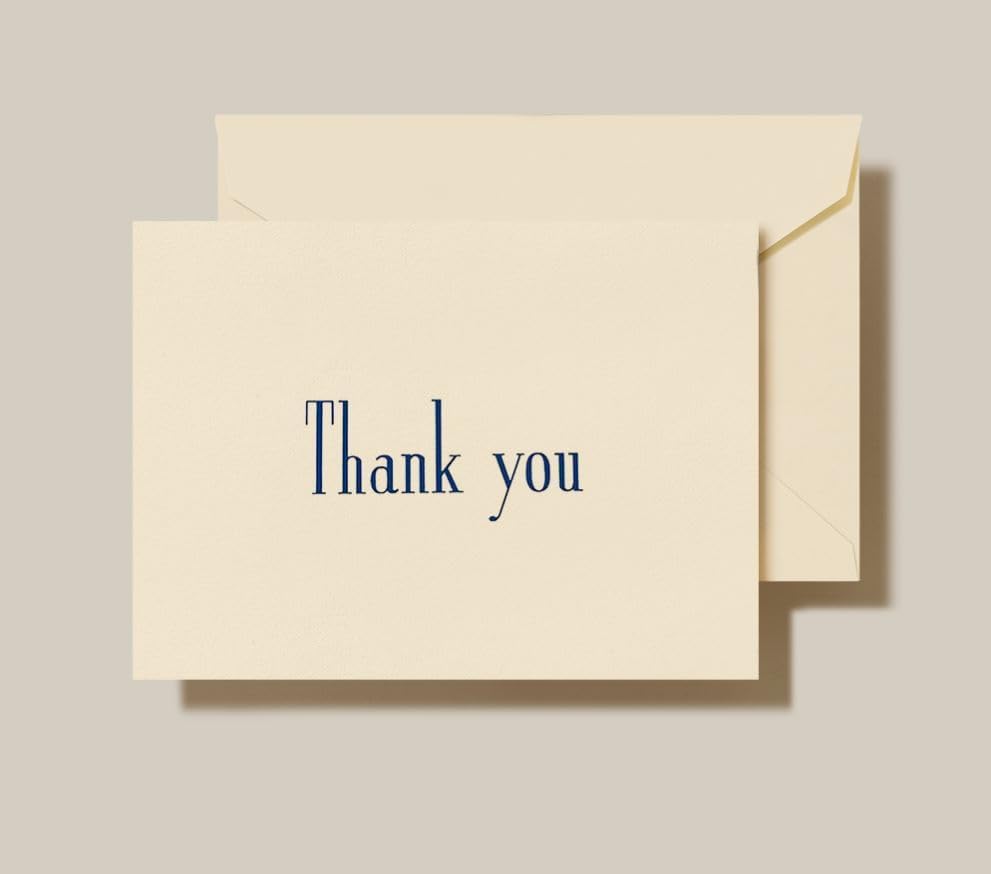 Their gift delighted you. Now return the favor with an urbane thank you note that artfully expresses your gratitude. Thermograph printed in navy ink on Ecruwhite Kid Finish. Matching envelopes included.