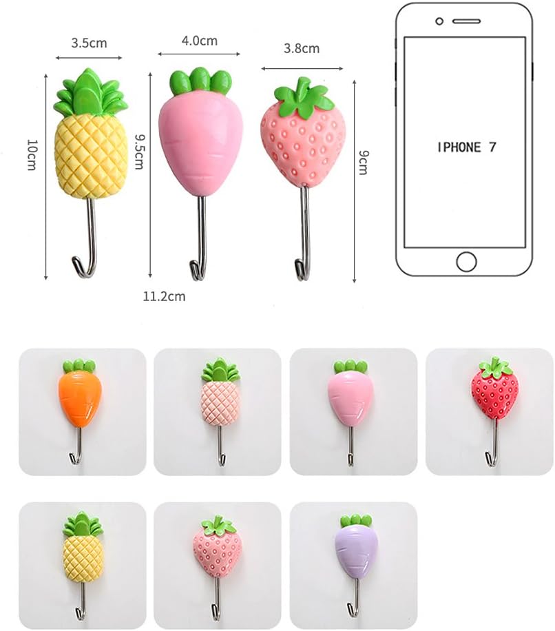 Add a touch of whimsy to your walls with our hand-painted Fruit Wall Hooks. Each hook is a unique, 3D-modeled artwork, featuring a different fruit design - strawberry, pineapple, carrot, or a surprise mix. Measuring 3.5 x 1.38 x 0.98 inches, these hooks are perfect for organizing keys, bags, or kitchen utensils in your kitchen, bathroom, or any room. They support up to 4 kg and come with three installation methods to suit various wall types. Made from safe, non-toxic resin and stainless steel, these hooks are not only functional but also a delightful addition to your home decor.