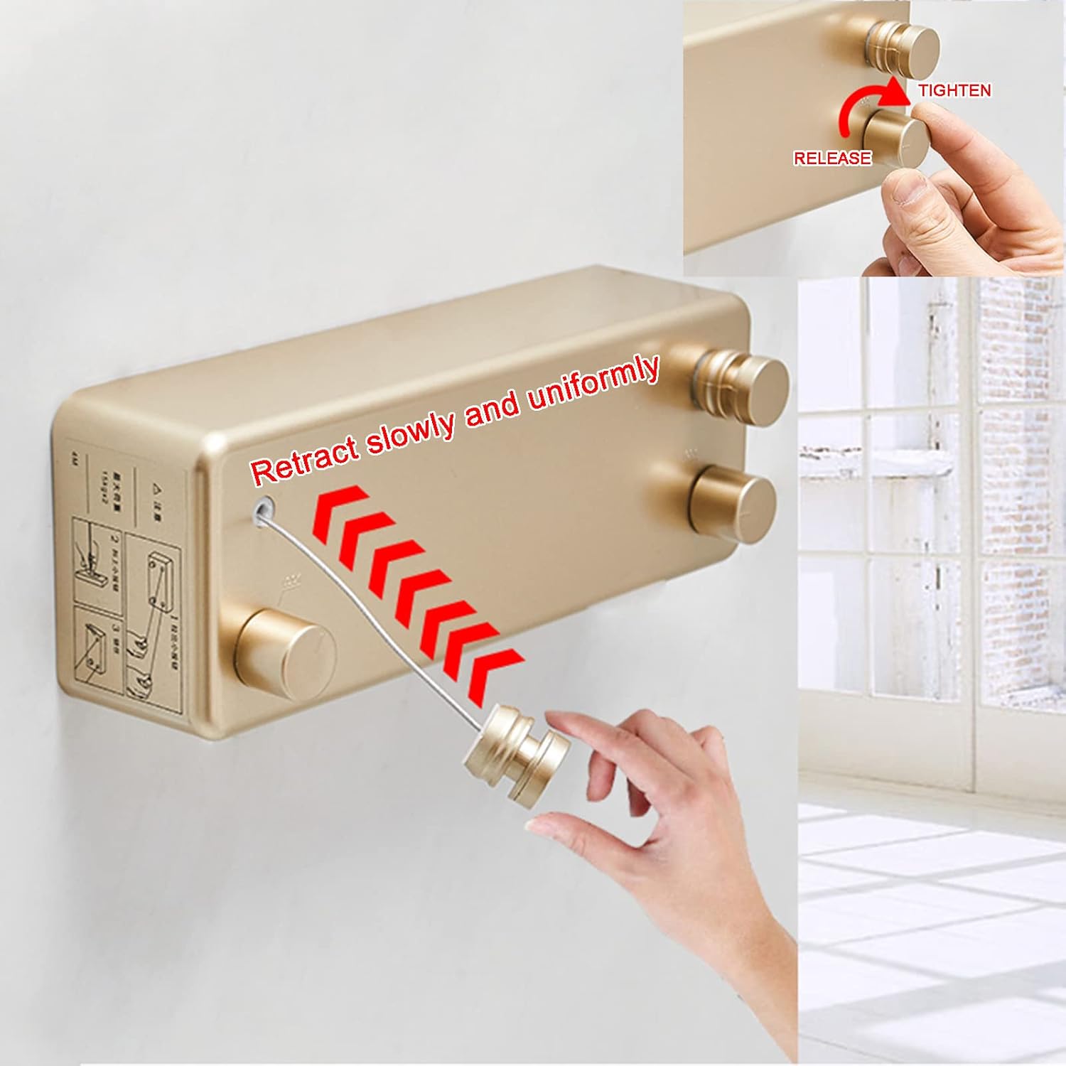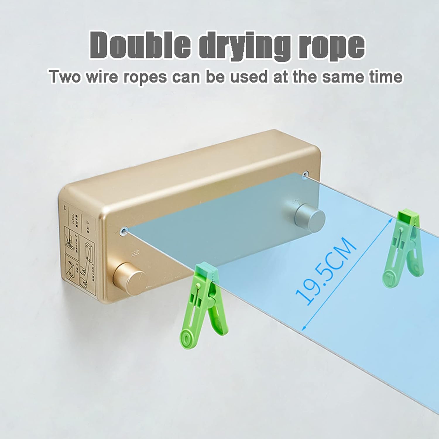 ◈Name: Telescopic clothesline◈Color: gold◈Steel wire material: 304 stainless steel wire wrapped in plastic layer◈Total length of the clothesline: double line 4.2m (13.8FT)◈Loading weight: 25 kg (55 lbs)◈Two installation methods: 1. Self-adhesive glue 2. Screws◈Package includes: 1 × clothesline, 1 × installation accessory kit, 14 x screws, 14x expansion tube, 1 × no-drilling glue, 1 × user guide Clothesline installation: 1. Use a towel to wipe off water and oil stains on the wall 2. Dispensing on the back of the secondary negative 3. Install the film on the wall and squeeze it hard for 1 minute 4. Apply auxiliary glue and stand still for 72 hours 5. Hang the main body after 12 hours