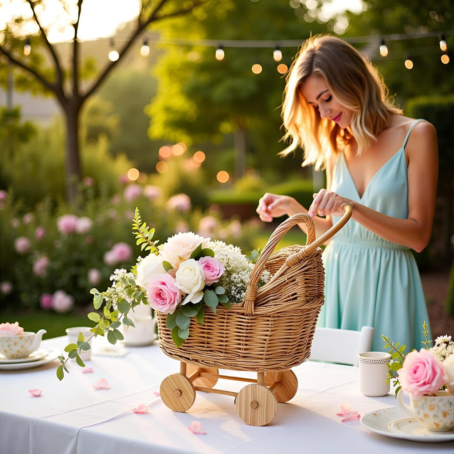 Handwoven Woven Rattan Stroller Flower Basket, Vintage Wicker Carriage Specifications: -Color: Light Brown -Material: rattan -Size: 35*24*42cm/13.8*9.4*16.5in, 25*19*31cm/9.8*7.5*12.2in Weight: 500g, 1000g Package included 1 x baby stroller