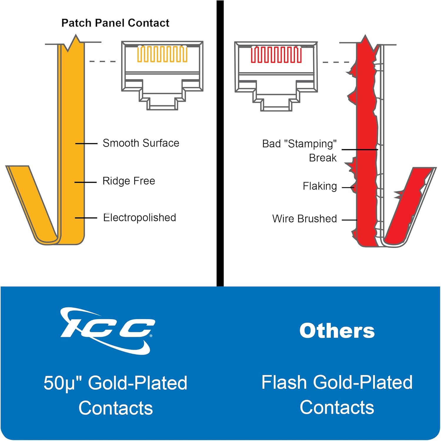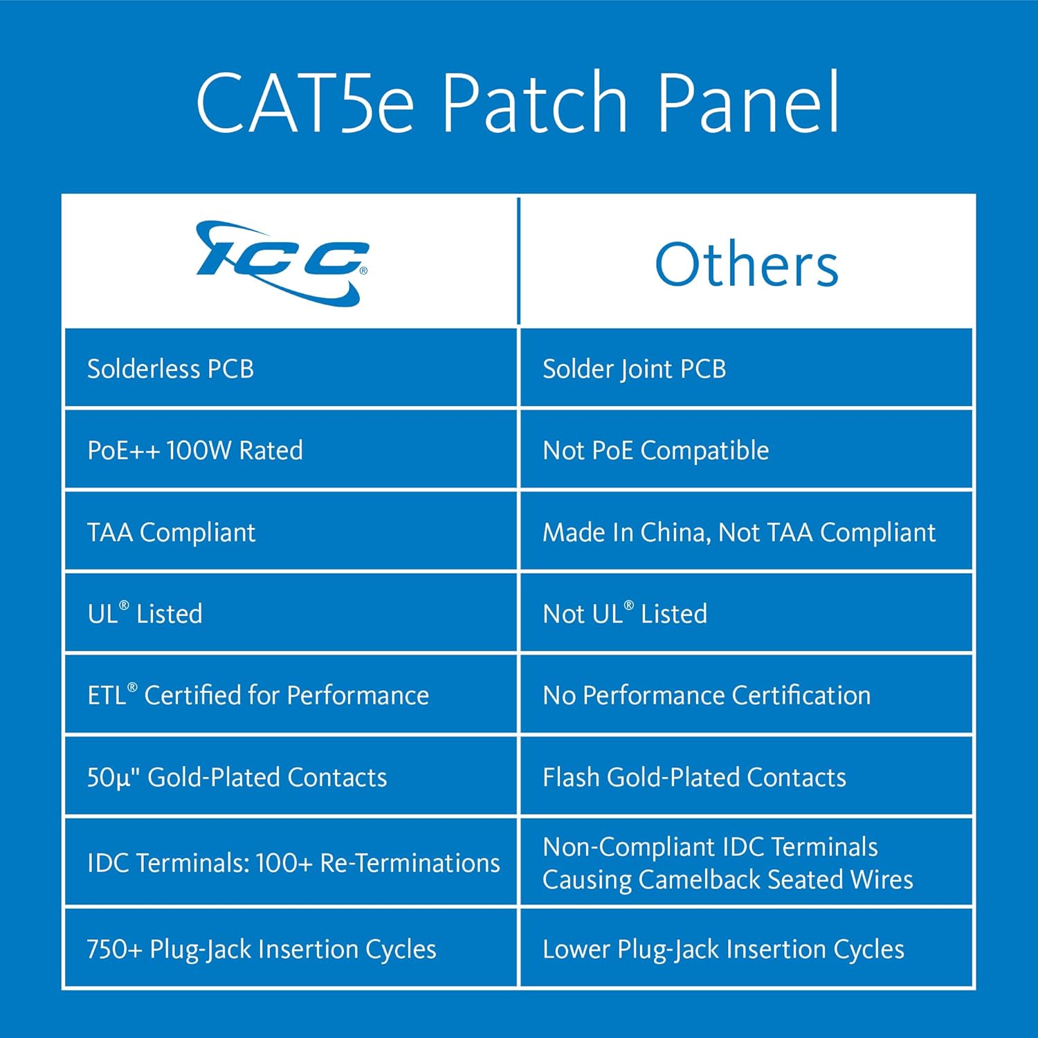 The ICC 24-Port CAT5e Patch Panel is designed to deliver high-performance connectivity for Gigabit Ethernet networks. Built with durable 16-gauge cold-rolled steel, this patch panel supports maximum speed and bandwidth while being backward compatible with lower-rated category components. Gold-plated contacts ensure correction-free connections, supporting up to 90W of Power over Ethernet (PoE++). Featuring 110 IDC termination blocks for efficient installation, it can be re-terminated over 100 times. Numbered ports and color-coded TIA-568A/B wiring diagrams simplify setup. Engineered to exceed ANSI/TIA-568 Category 5e standards, it enhances crosstalk cancellation for superior network performance. UL listed and built for long-lasting reliability in standard 19” racks.