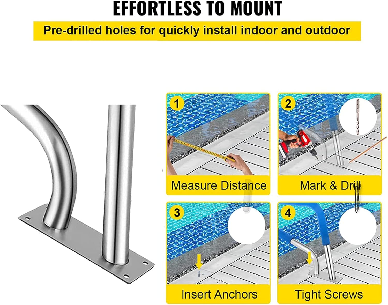 This all stainless steel handrail is ideally suited to any size swimming pool. The rails have a small footprint and are designed to take up minimal deck space, while ensuring safe and solid support for access to the water. The stainless steel design ensures that your handrails will not rust or stain for years to come. Product features ---High quality 304 stainless steel material for durability. --Humane curves, based on hydrodynamic principles, nicely decorate your pool. --Easy to grip, perfect firm fit, helps to get in and out of the pool and provides a sense of security. --Simple bolt-on installation, easy to install. Product Specifications. Product Name: 304 Stainless Steel Pool Rail, Pool Railing Product Colour: Silver Product Material: 304 Stainless Steel Weight capacity: 375 lbs/170 kg Product Size: 31.8 "L x 22.8 "H/81 x 58 cm Tube diameter: 1.9"/4.9cm Base plate size: 13.8 "L x 3.9 "W/24.5 x 10 cm Pre-drilled diameter: 0.4"/9.5 mm Product weight: 12.1 lbs/5.5 kg Care: When the stainless steel handrail gets dusty, it can be wiped directly with a dry cloth. Product list 1X304 Stainless Steel Pool Rail, Pool Railing 1X Installation Tool Precautions. Fixed swimming pool ladders are very easy to install. We recommend that you use a hammer drill to make holes in the concrete.
