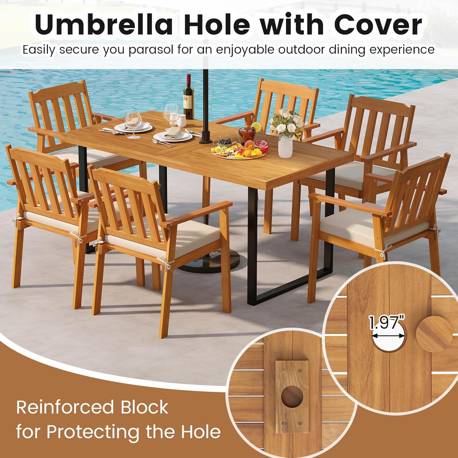 Description: A long-lasting investment for your indoor and outdoor dining! Crafted from solid acacia wood, the rectangular patio dining table is built-to-last with excellent deformation resistance and high hardness. With a dimension of 63”L x 32”W x 30”H, the large outdoor dining table is ideal for accommodating gatherings of 4 to 6 individuals. Additionally, the wooden table is supported by a sturdy metal frame and equipped with adjustable foot pads for added stability on uneven surfaces. The inclusion of a 1.97” umbrella hole allows you to easily secure your parasol for an enjoyable outdoor dining experience. With a slatted tabletop design that simplifies upkeep, this timeless piece seamlessly enhances any setting, fostering a warm and inviting ambiance for courtyard, poolside, sunroom, deck, porch, garden or dining room. Note: Please avoid leaving it outdoors in the rain for long service life. Features: Acacia wood tabletop is solid and anti-cracking Stable U-shaped metal base and reinforced triangle structure increase the sturdiness Equipped with adjustable foot pads to keep stability 1.97’’ umbrella hole with cover is concealable when not in use Equipped with a reinforced block for protecting the hole Slatted tabletop allows for easy maintenance Natural appearance fits seamlessly with outdoor environments Please apply wood polish oil (not included) regularly to extend the lifespan When you use the parasol, an umbrella stand is required (neither is included) Specifications: Color: Natural+Black Material: Acacia Wood, Metal Overall Dimension: 63” x 32” x 30” (L x W x H) Diameter of the Umbrella Hole: 1.97” Weight Capacity: 165 lbs Net Weight: 42 lbs Package Includes: 1 x Outdoor Dining Table 1 x User’s Manual