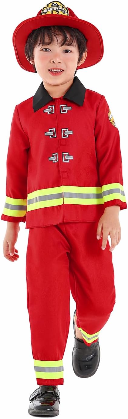 This fireman costume is everything a child needs to look The part. Includes helmet, top and pants. Outfit is made of 100% polyester. Shoes not included.