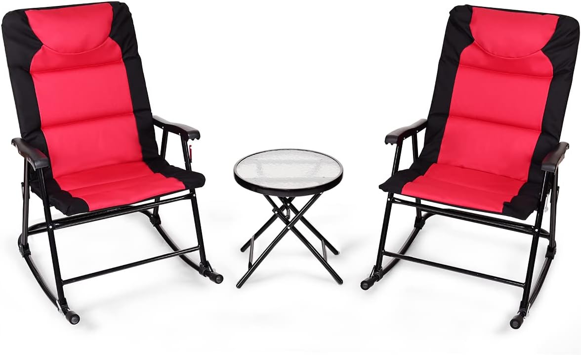 DescriptionThe combination of 2 rocking chairs and 1 glass coffee table can make a great addition to your patio or deck. Unlike ordinary chairs, our chairs come with added rocking feature can provide you with more relaxed experience. Solid steel construction and premium PVC fabric ensure long lasting durability. The coffee table comes with tempered glass is perfect for holding drinks or wine. The thick padded cushion, backrest and headrest offer optimum comfort. Equipped with locking pins, the chairs will be more stable to ensure your safety during using. Because of the foldable design, our rocking chairs and table can be stored in any compact place when not in use. You can also bring this outdoor furniture set with you when you go out for camping. This fabulous folding rocking chair and table set will make your outdoor life more relaxed and enjoyable.Feature2 rocking chair and 1 coffee table set make a great addition to your patio Solid steel frame construction and high quality fabric for durabilityCoffee table with round tempered glass is ideal for holding your refreshmentsChairs with armrests and soft cushions offer you comfortable seating experienceFolding design for easy storage and transportationLocking pin design for added stability and safety Non-slip mats on the feet of chairs and table prevent scratching the groundSpecificationColor:Blue/RedMaterials: Steel frame+ vertical cotton+600D PVCSize of Table: 18”x18”x 19” (L X W X H)Size of Chair: 35.5”x 27”x 41.5” (L X W X H)Net weight: 36 lbsMax load capacity of chair: 265lbsMax load capacity of table: 66lbsPackage includes:1 X Folding Table2 X Folding rocking chair