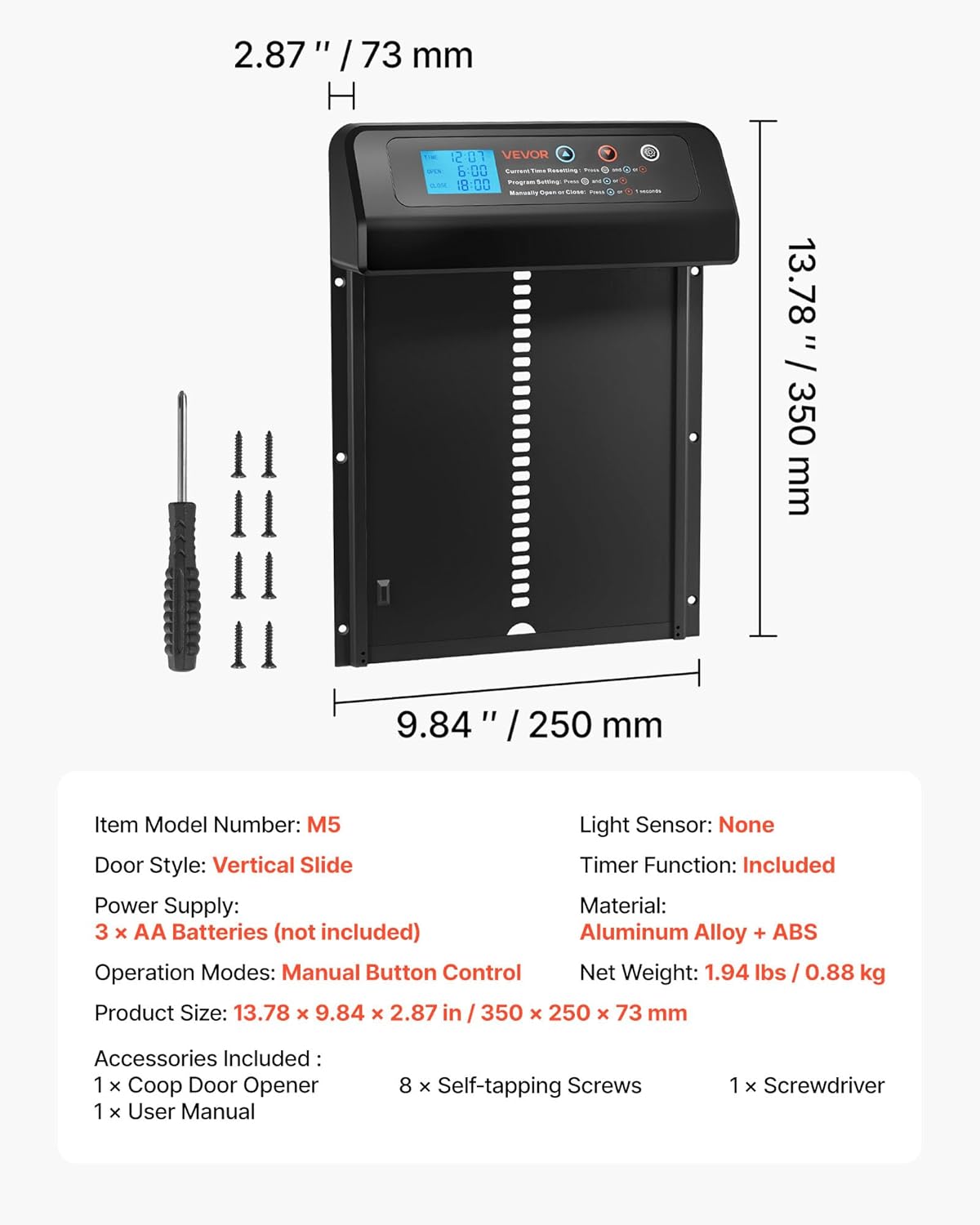 | Included Components | 1 × Coop Door Opener, 1 × Screwdriver, 1 × User Manual, 8 × Self-tapping Screws |