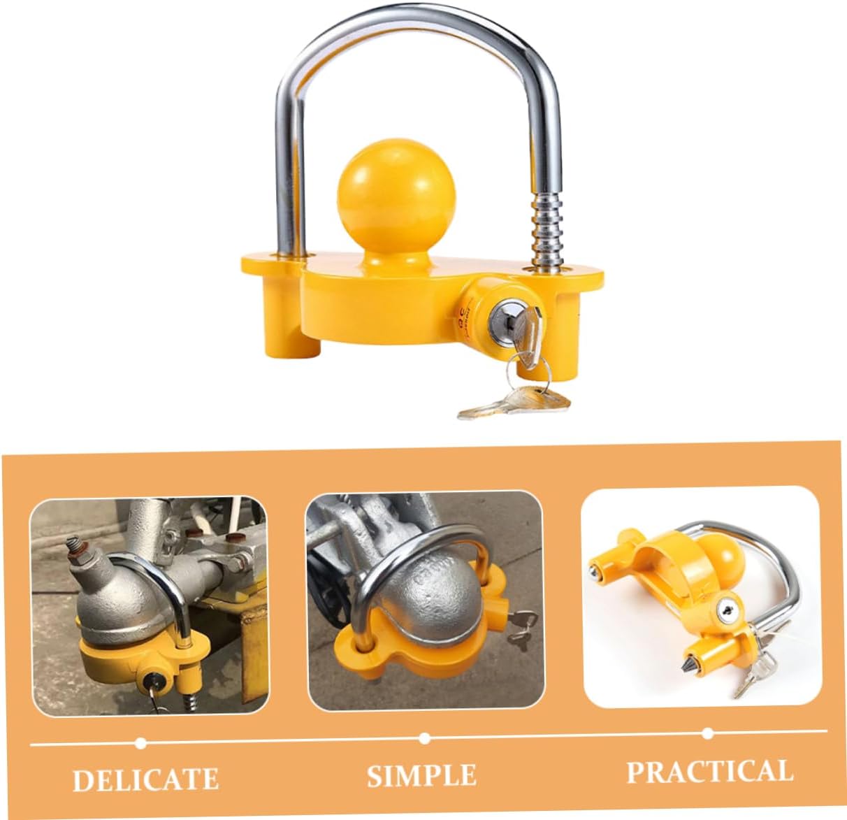 Package List 1 x trailer lock Features -Material:Aluminum alloy,iron camper trailer accessories -Size:15.70X14.30X8.00cm/6.17X5.62X3.14in hitch locks -Wide application: ideal for cars, boats, rvs, and more, this hitch lock is versatile and meets various needs rv lock - : made with wear resistant materials, this lock is durable and longterm use rv locks for travel trailers -Secure attachment: highstrength materials ensure a firm connection, preventing loosening and ensuring driving safety accessories -Adaptable fit: the lock adapts to various vehicle hitch connections, providing convenience and practicality lock for trailer -Theft deterrent: the design deters theft, protecting your trailer hitch trailer locks -Color:Yellow truck hitch lockGoods Descriptionlock for trailer Ideal for use with travel trailers, boats, and RVs, this lock is for anyone looking to safeguard their towing equipment.boat trailer lock Its anti-theft design and durable materials provide excellent protection.trailer coupler locks Ensure the safety of your trailer with this hitch lock