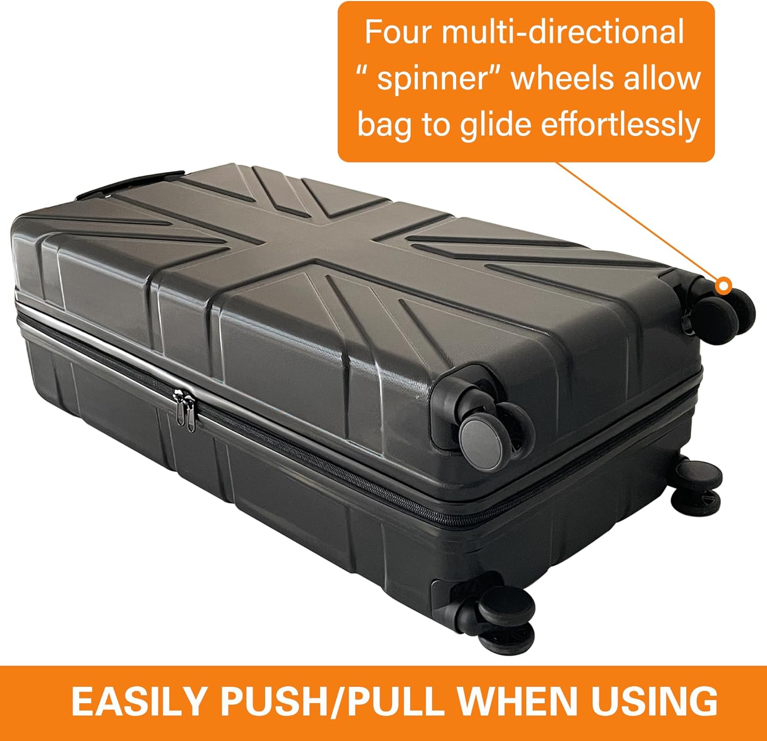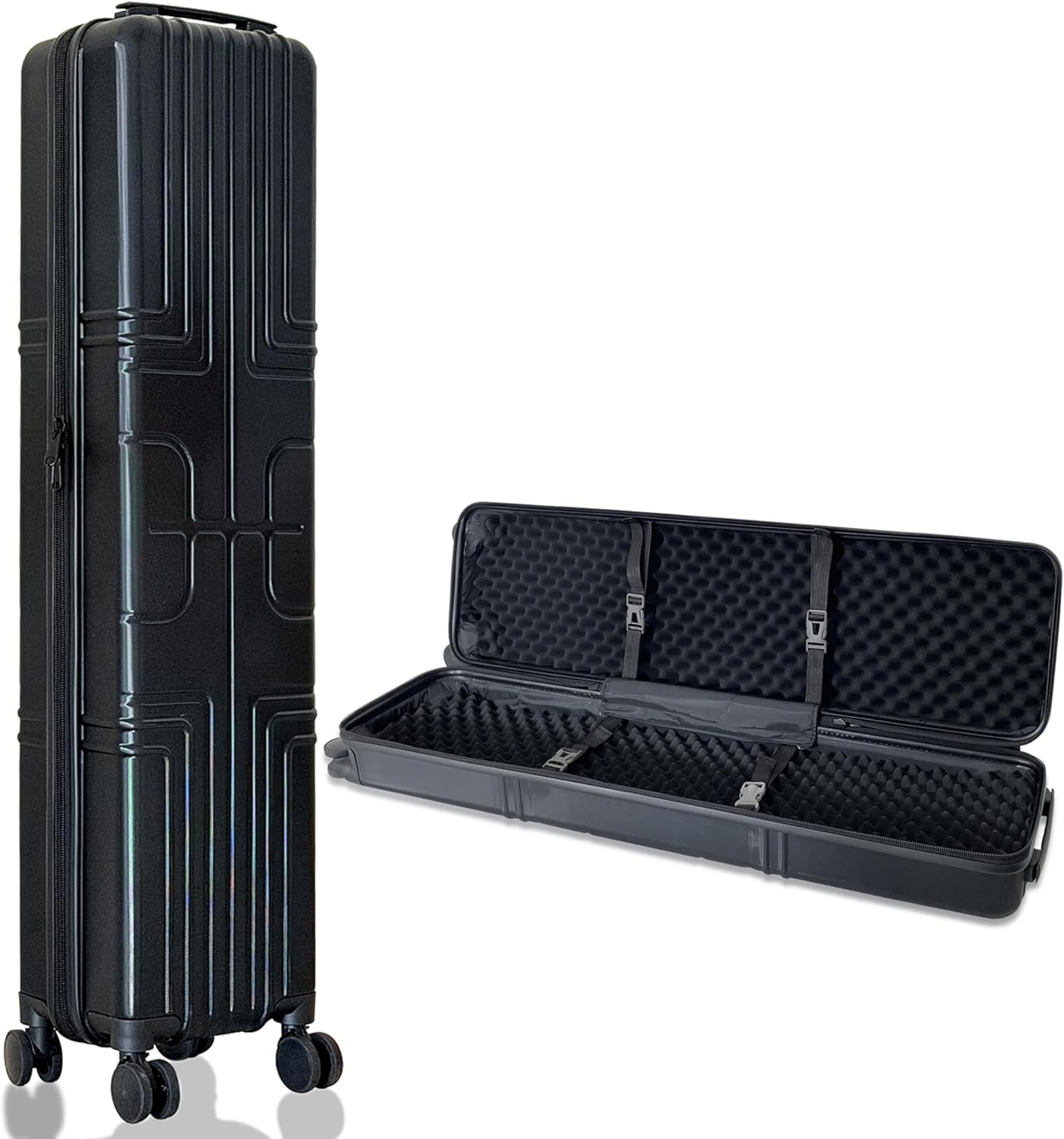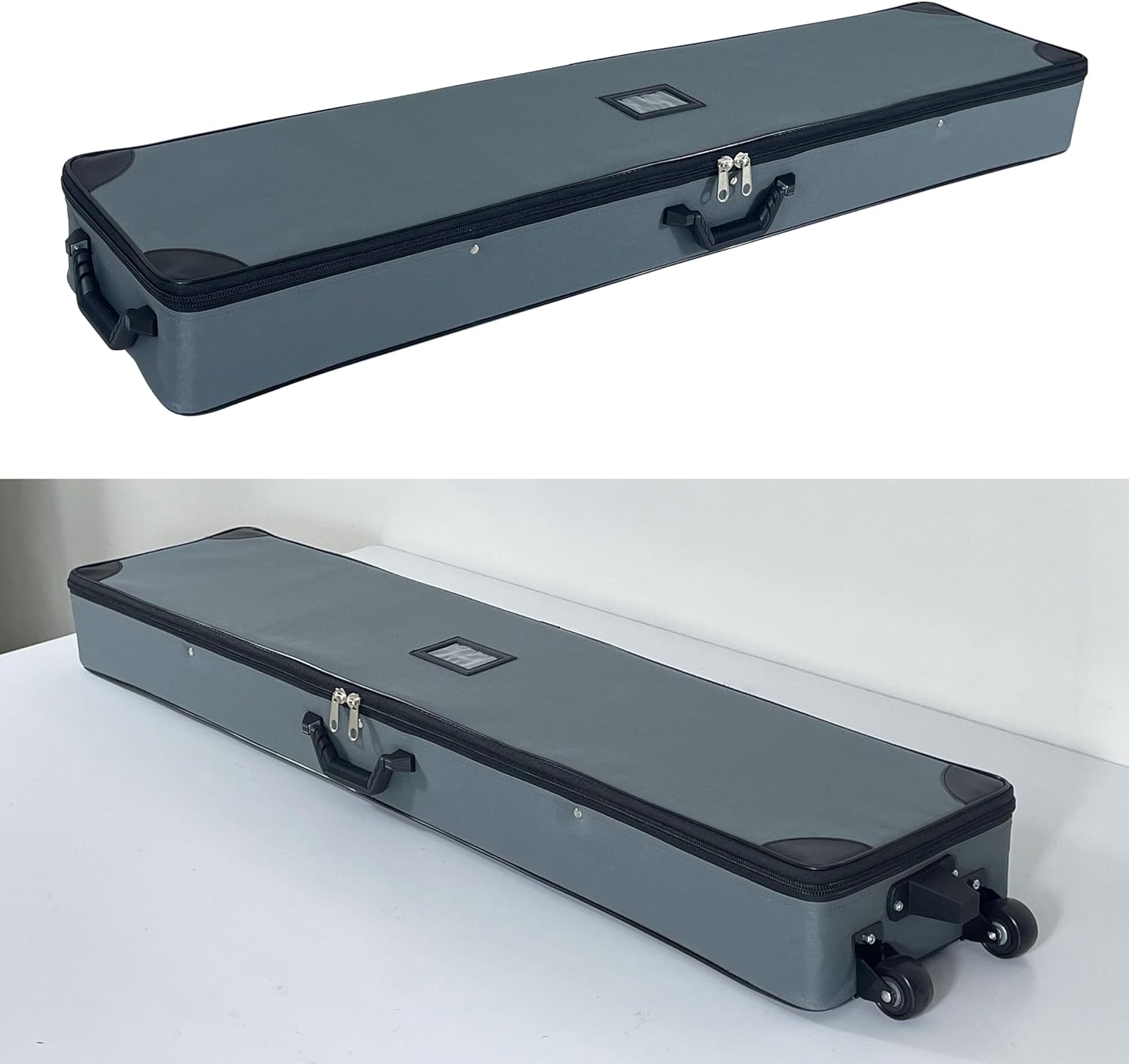 Molded plastic hard carry case with inset wheels for easy mobility Case also has a center grip. Dimensions: Case Outside Dimensions: 16.5"W x 45.5"H (w/wheels) x 11.5"D Case Inside Dimensions: 35"x17.5"x11.5" For luggage and booth reception