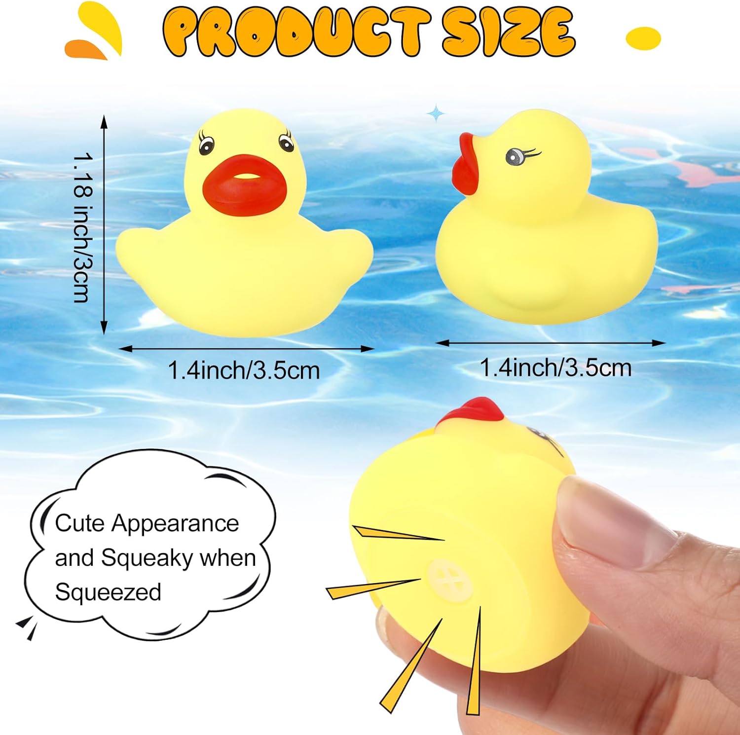 Features: Cute mini yellow rubber duck: The rubber duck is cute and squeaky. Babies would be attracted by the sound from these ducks and let them enjoy the bath time. Specifications: Material: rubber Color: as picture shown Size: as picture shown Package includes: 300 x Rubber ducks Notes: Manual measurement, please allow slight errors on size. The color may exist a slight difference due to different screen displays.
